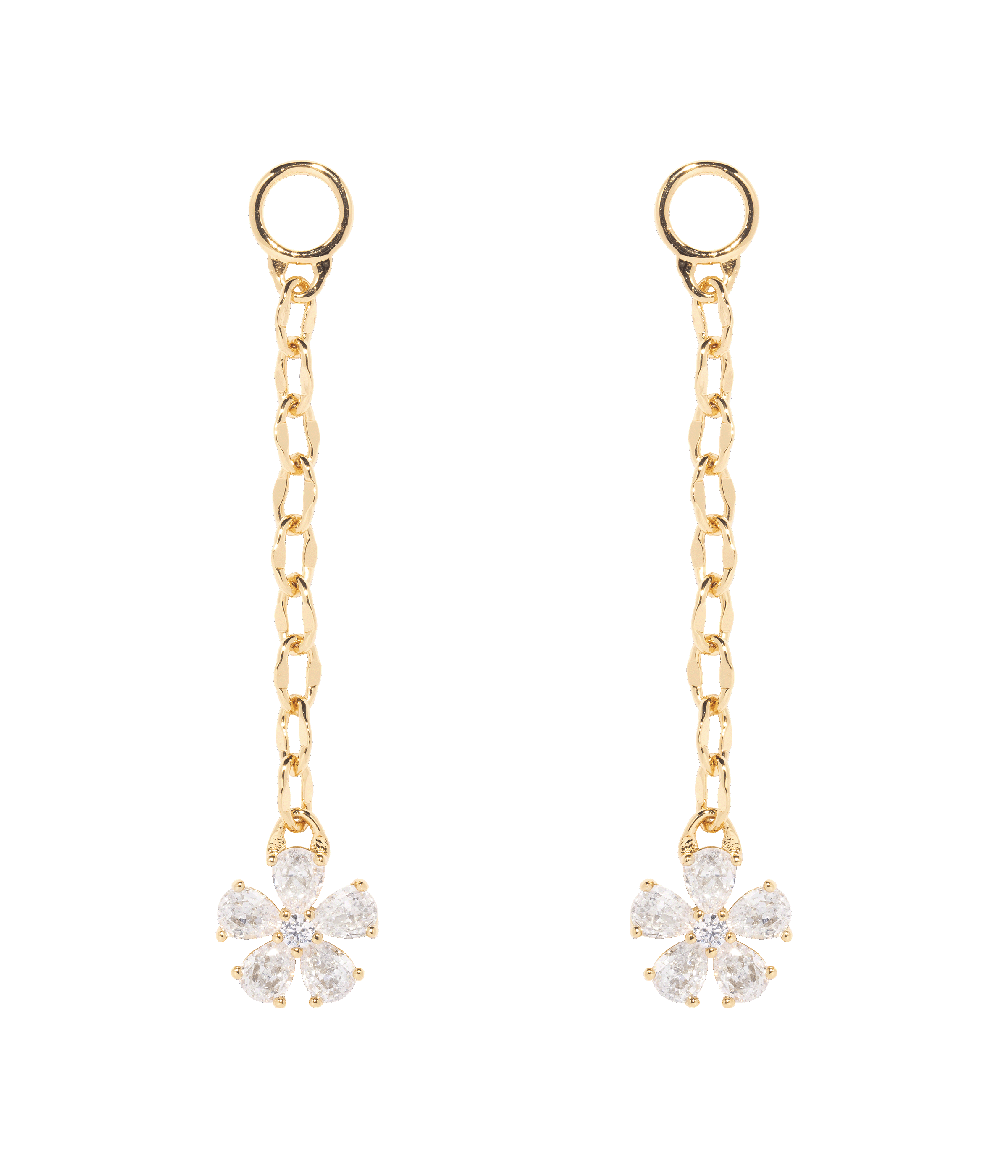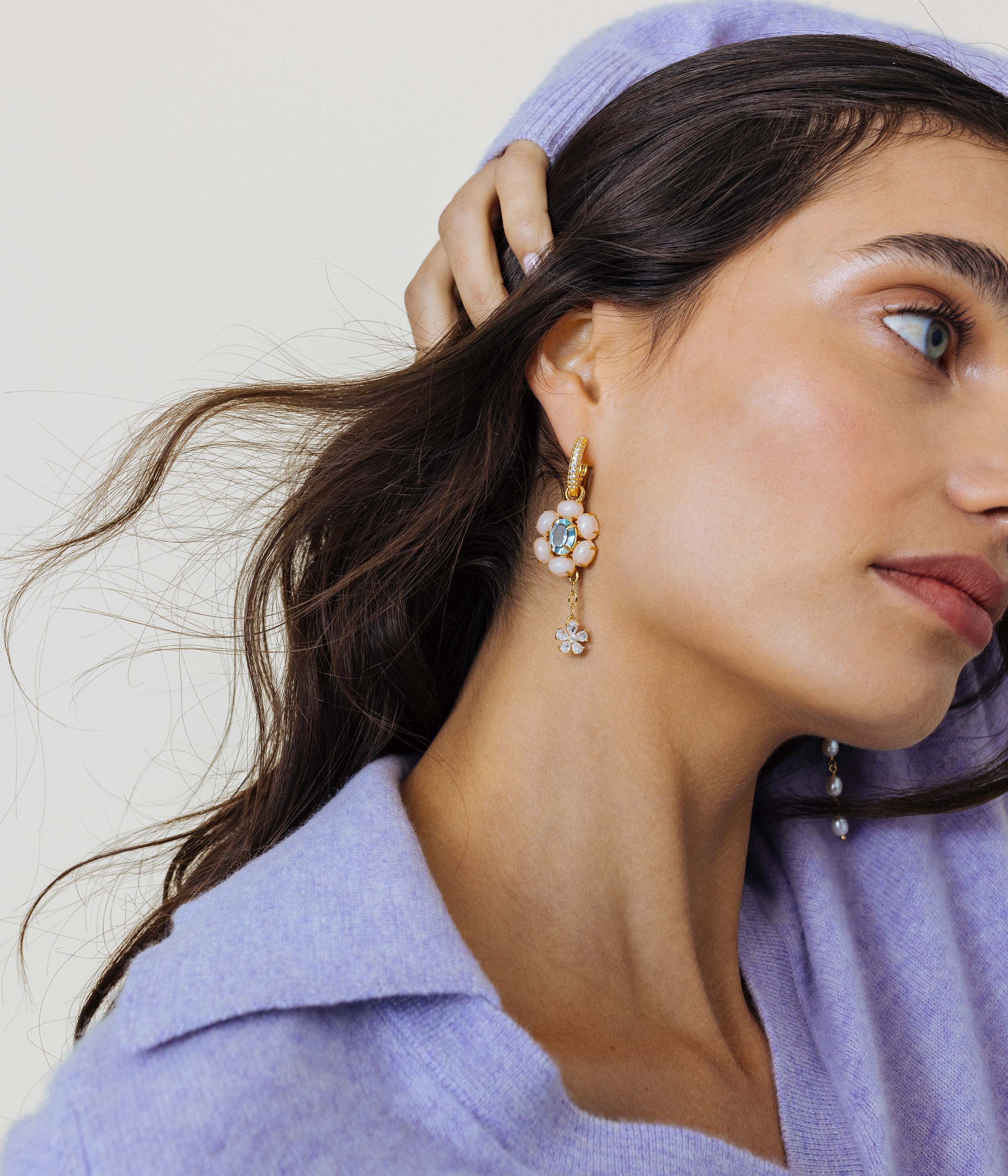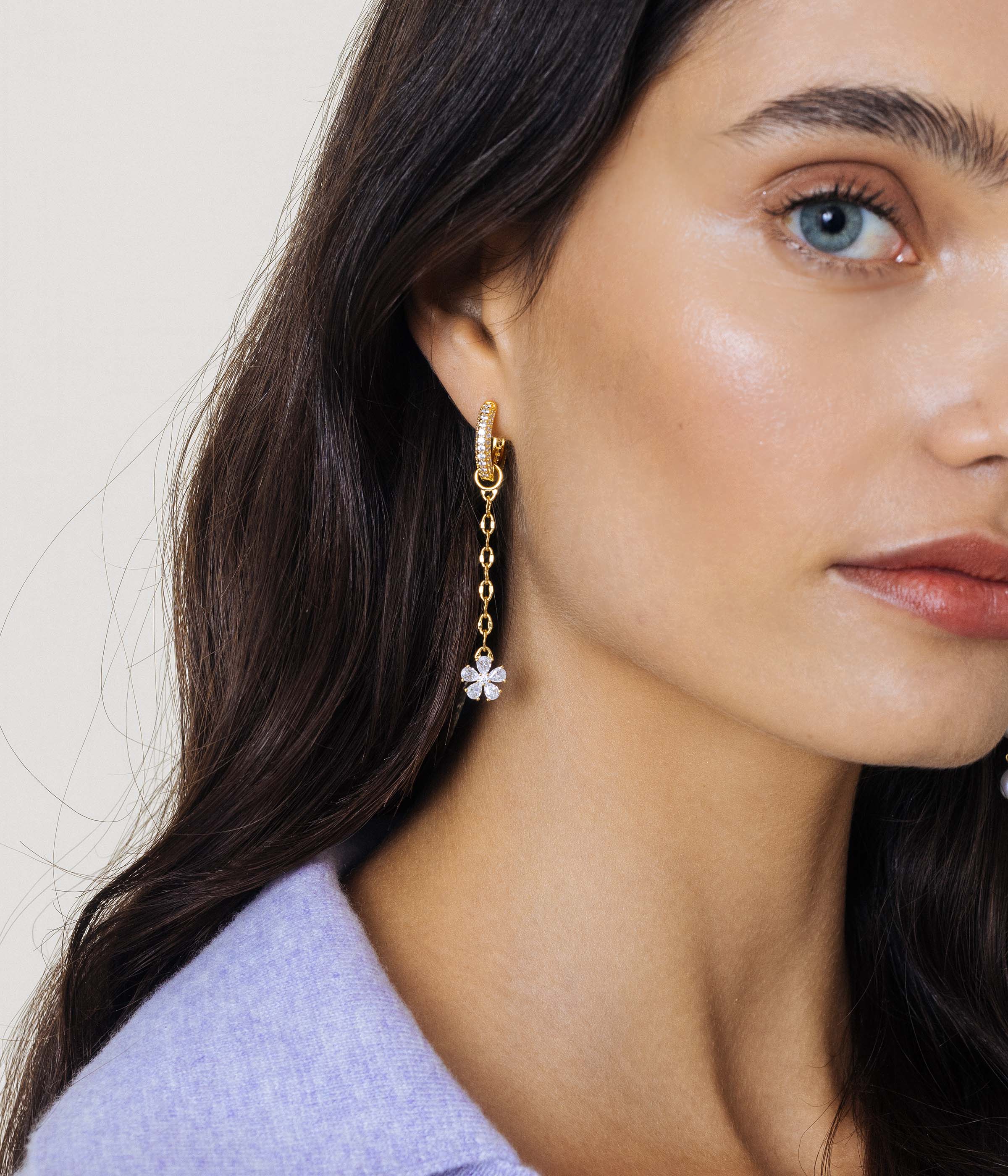 We love these long chain charms anchored by a teeny crystal flower to wear on our huggie hoops. Add these behind another shorter charm like the Trudy Huggie Charm for a layered floral look.