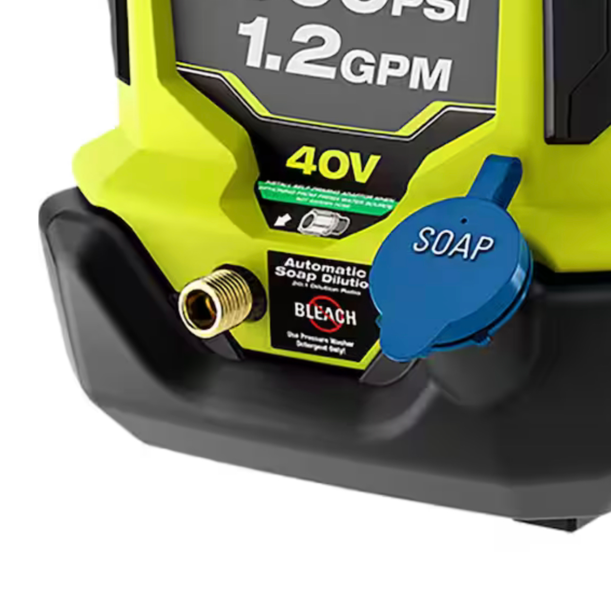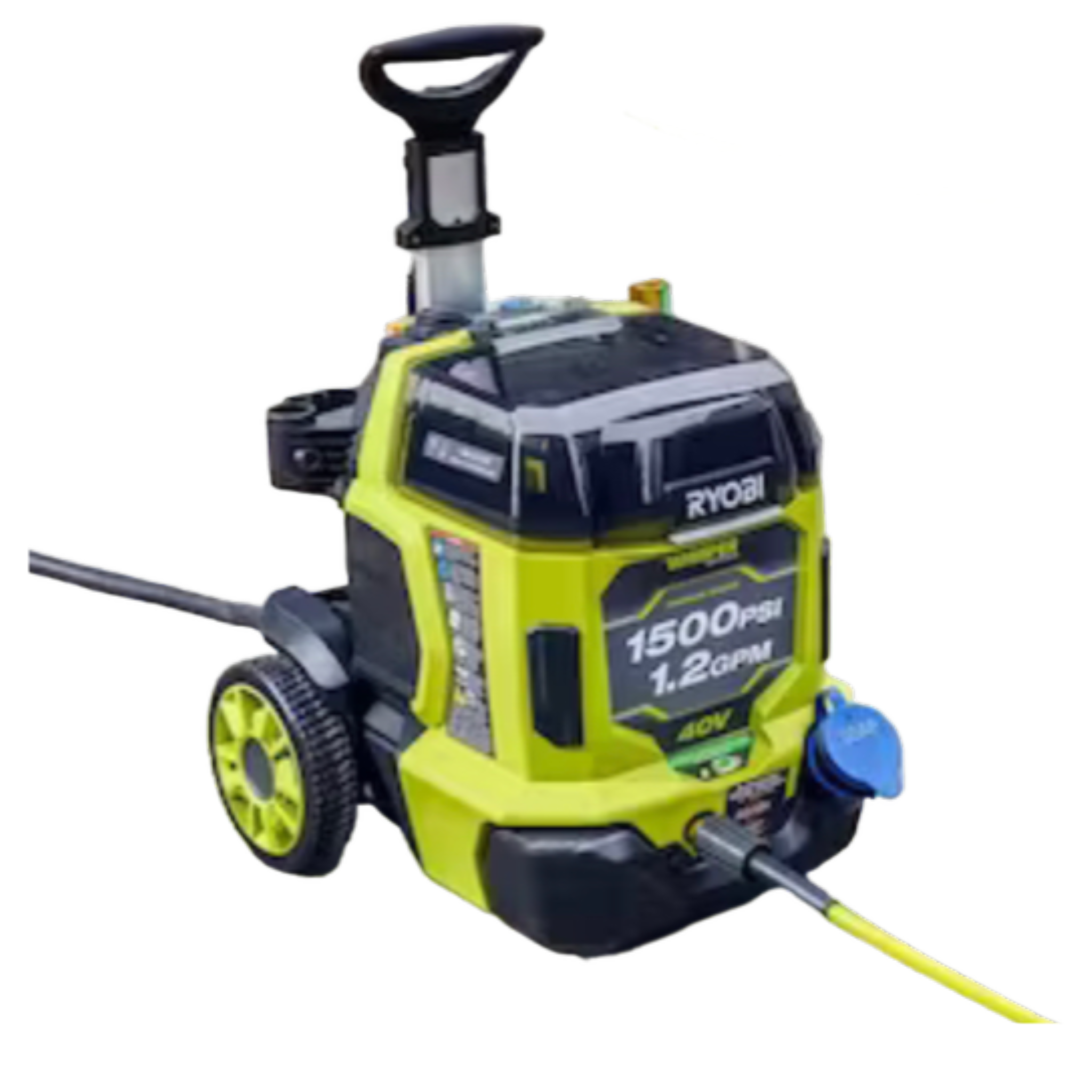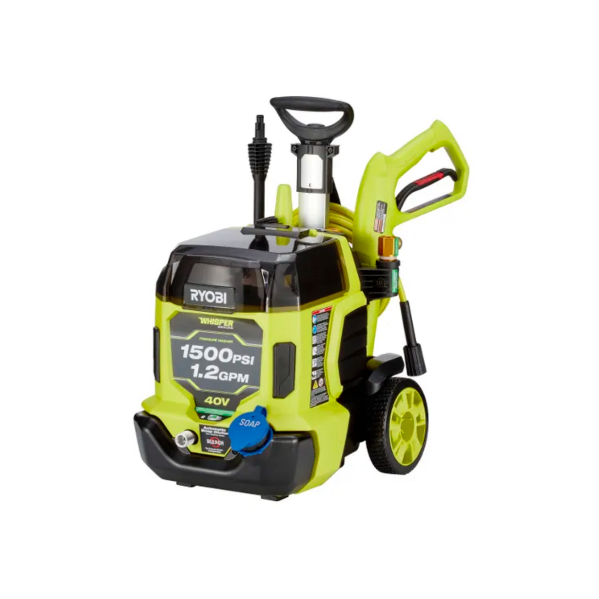 The 40V HP Brushless 1500 PSI 1.2 GPM Pressure Washer is the perfect, easy-to-use, portable, cordless pressure washer. This pressure washer utilizes (2) 40V batteries and a brushless motor to provide hassle free cleaning, eliminating the hassle of gas and electrical cords. Use this pressure washer at home by connecting to any standard garden hose. For remote cleaning, pull water from any fresh water source like a lake, pool, or bucket with the included 10 ft. siphon hose. This pressure washer is easy to start, just insert the batteries(sold separately), connect to a hose, and push the start button. For maximum runtime, use this pressure washer on the default setting for 1000 PSI performance. When ultimate power is needed, unleash 1500 PSI on boost mode. Ideal for cleaning sidewalks, patio furniture, windows, recreational vehicles, and so much more. The pressure washer is WHISPER SERIES, making it the perfect tool for quiet cleaning. It is equipped with wheels and a telescoping handle for easy transport. This includes a quick connect spray wand with (3) 1/4" quick-connect nozzles: turbo, 15°, and soap. Use the soap nozzle with detergent in the on-board soap tank to tackle dirtier messes. When the job is done, store the nozzle on the on-board accessory storage. The RYOBI 40V HP 1500 PSI 1.2 GPM Cordless Pressure Washer combines portability with convenience and allows you to go anywhere the cleaning task awaits.