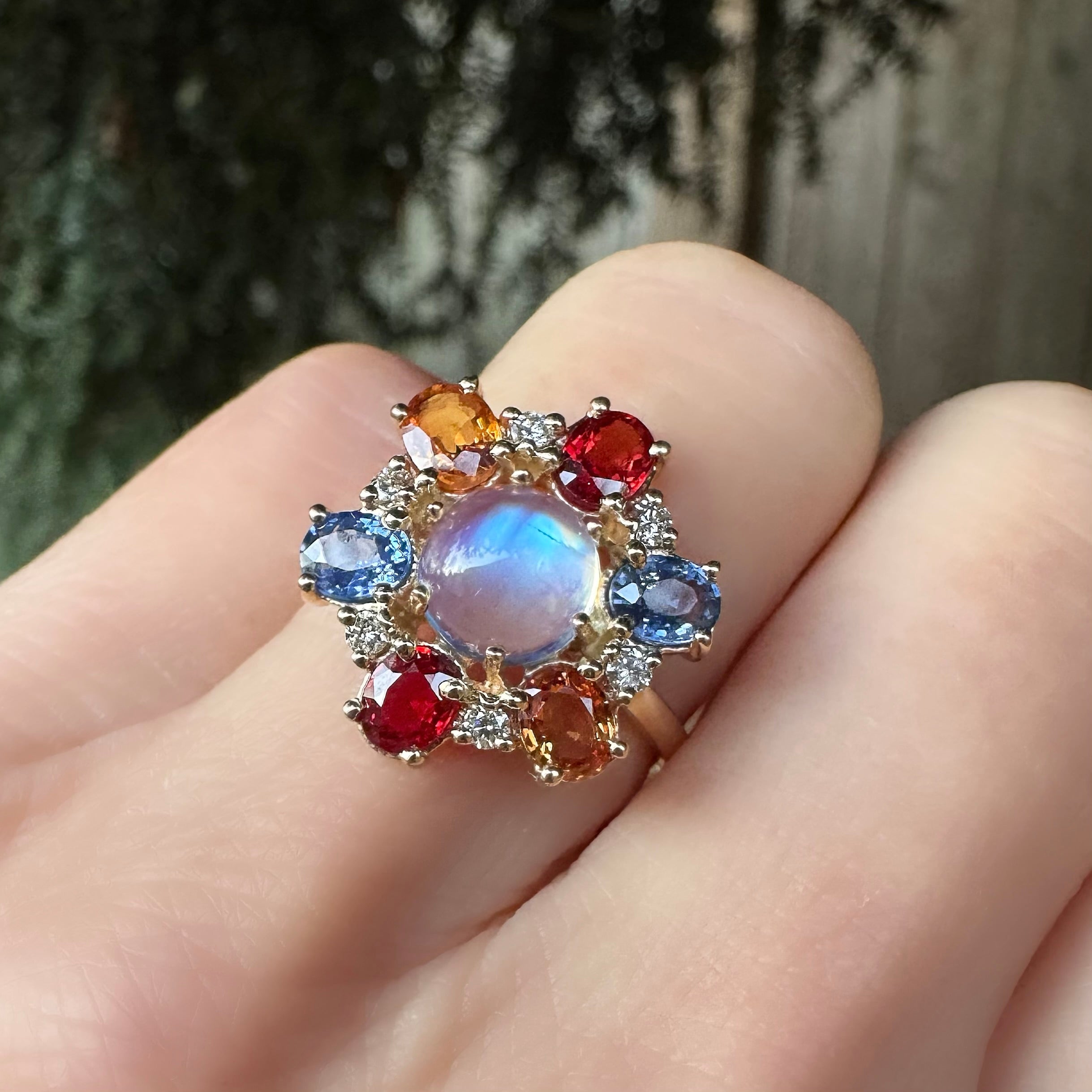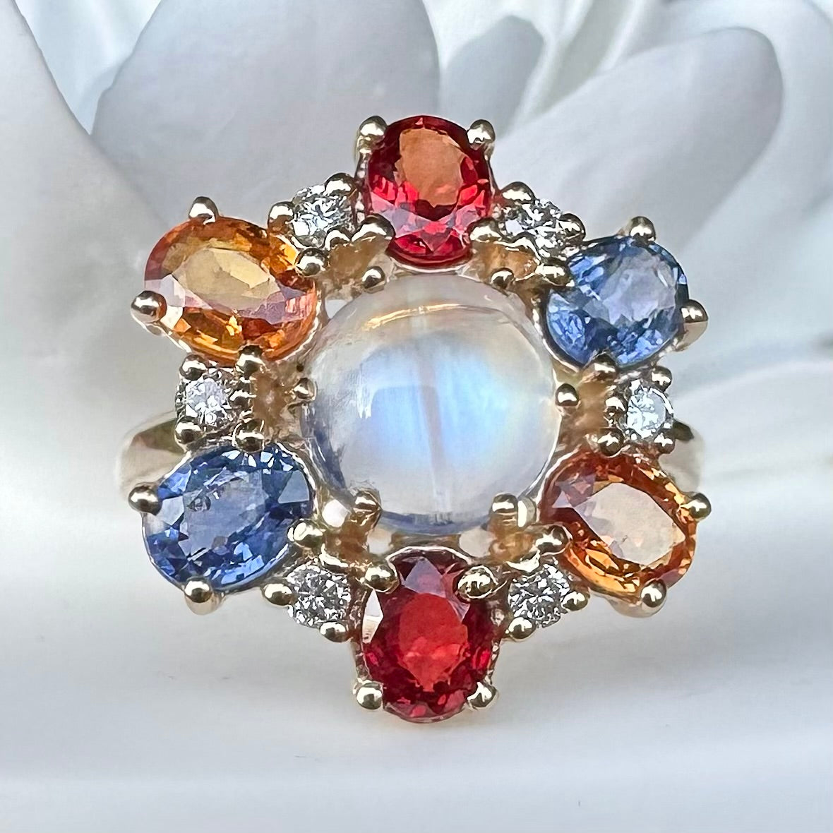 A beautiful floral ring with a rainbow of brilliant sapphires surrounding a bright white diamond, set in 14k gold.